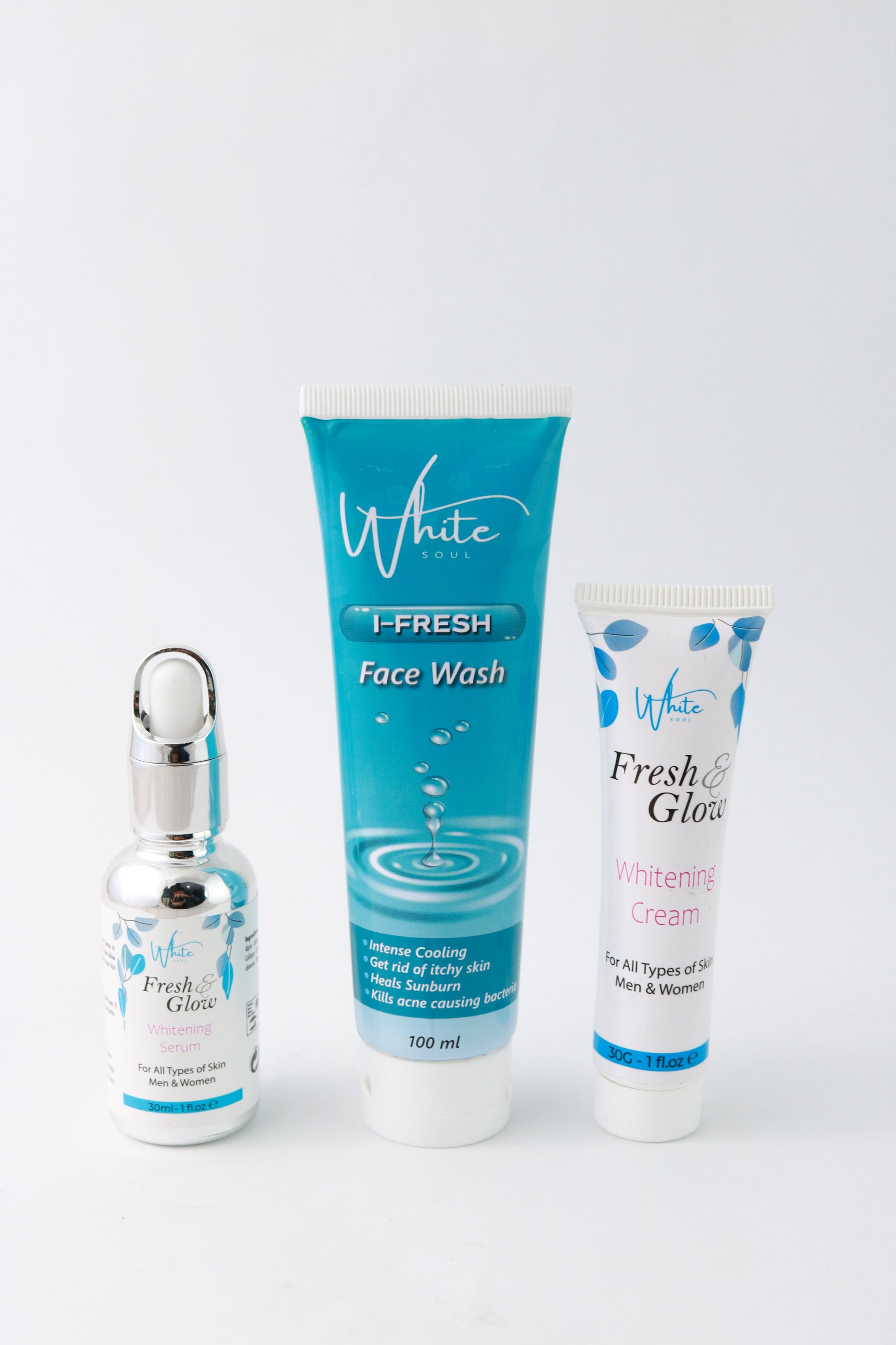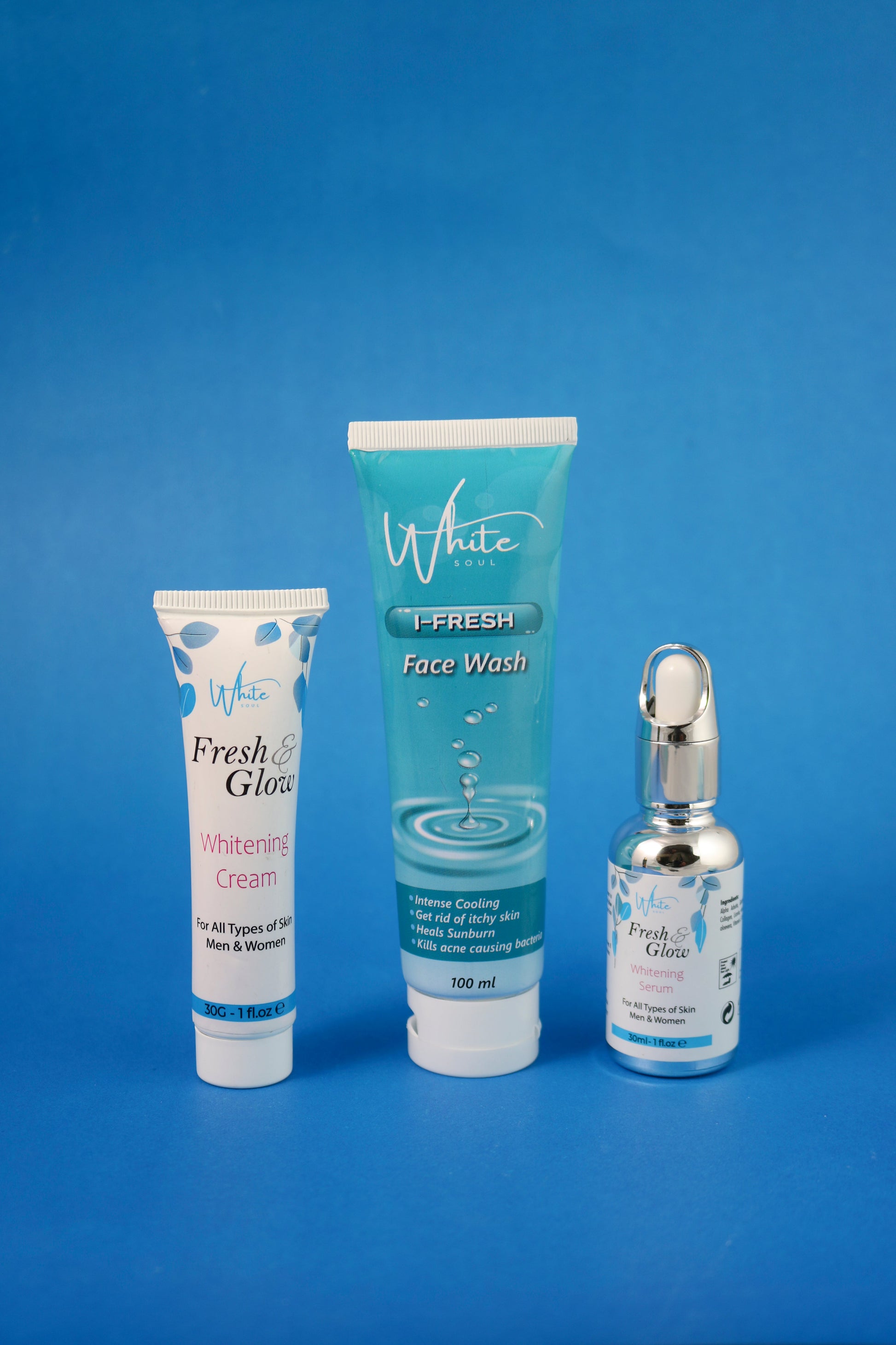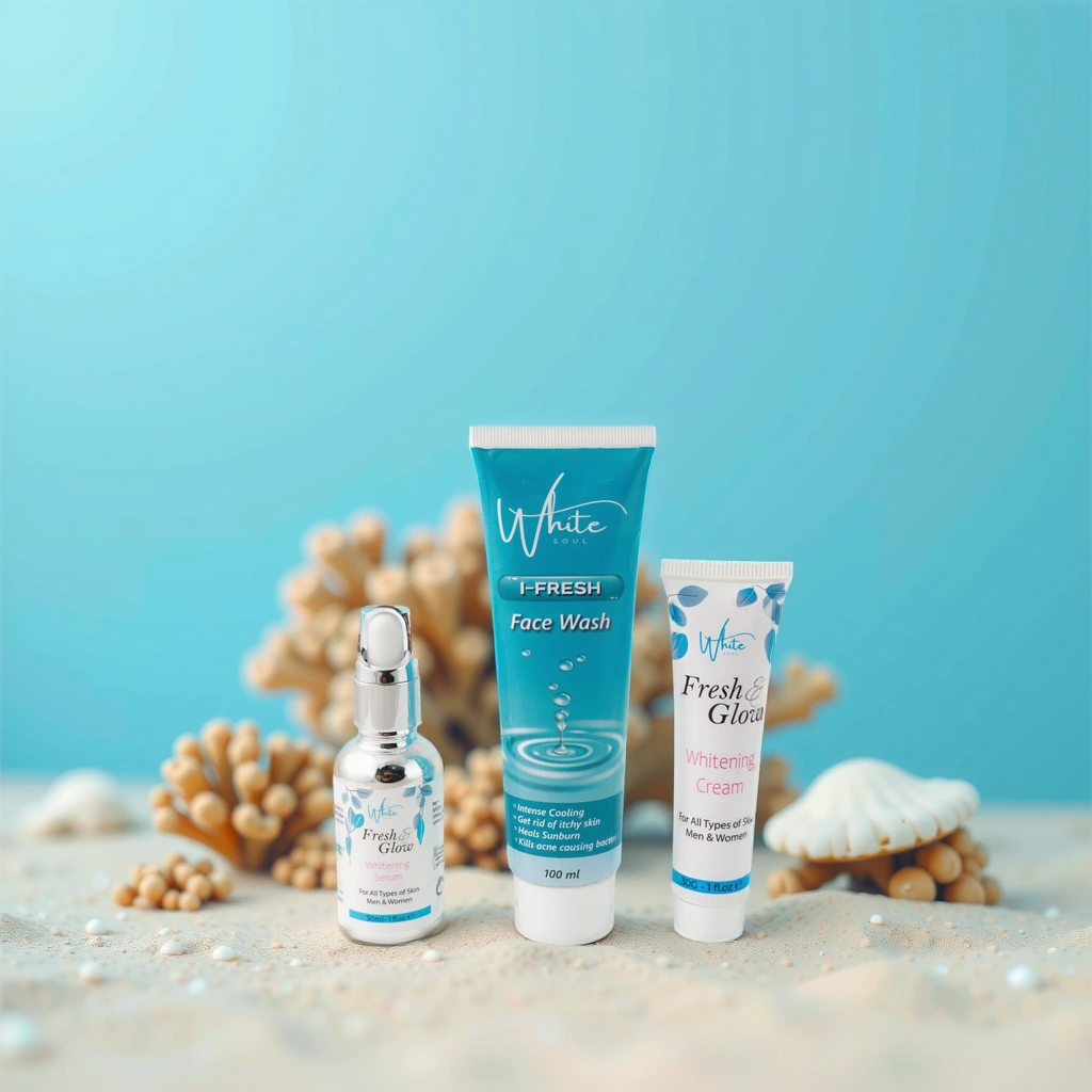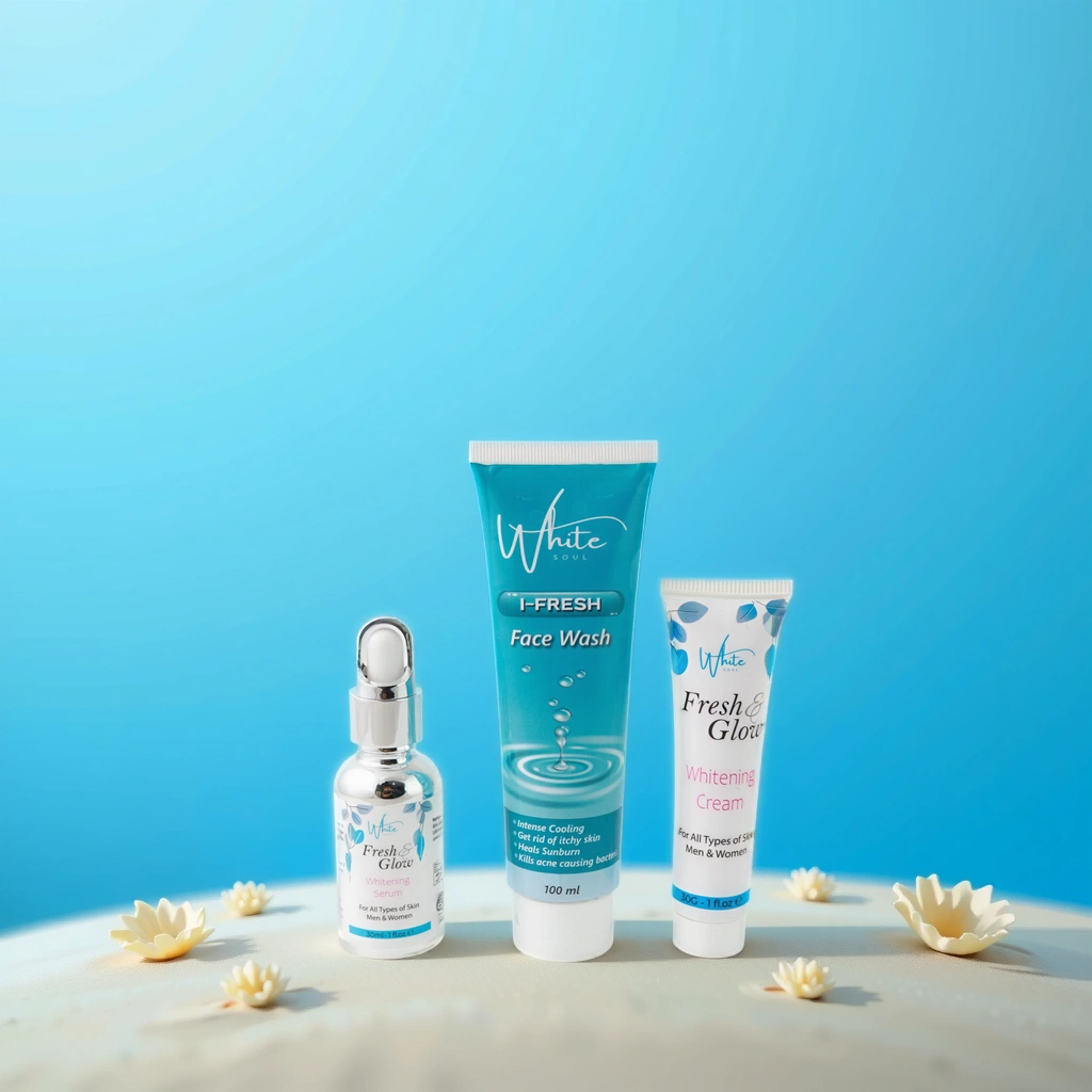 The Fresh and Glow-Whitening Kit offers a powerful blend of skincare benefits designed to refresh and rejuvenate your complexion. This kit helps tighten and brighten the skin while providing intense hydration to reduce pigmentation and combat free radical damage caused by environmental stressors. It effectively calms irritated skin, promoting a healthy and radiant complexion. The combination of potent ingredients works to smooth and soften skin texture, reducing dark spots and uneven pigmentation. With its skin-brightening properties, the kit also supports anti-aging by maintaining skin elasticity and plumpness, helping to reduce wrinkles. Additionally, it promotes healing of scars, burns, and other skin injuries, leaving the skin feeling revitalized and youthful.
